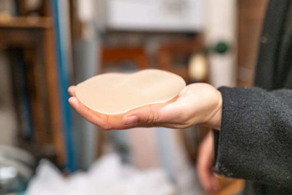 Da dagens besøg på magasinet lakker mod enden, står Anne Bea et øjeblik stille foran en af reolerne. Hun får øje på en gammel demokasse med brystimplantater, vender en i hånden og klemmer let om den.