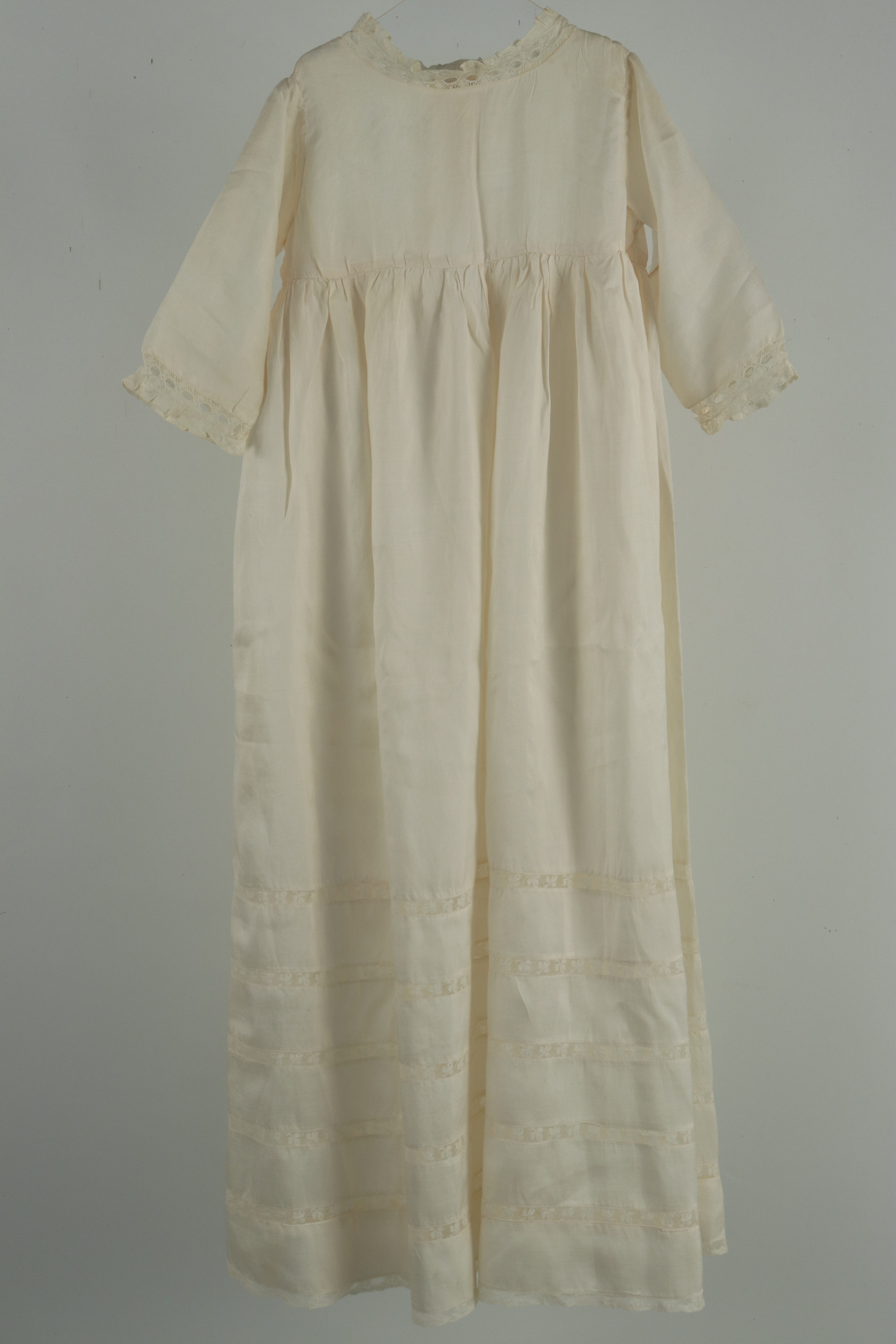 Æggeskalsfarvet dåbskjole i lærredsvævet silke med kniplede blonder og lange ærmer (LUA: 15 cm). Overdelen har rund hals og lange påsyede ærmer med blondekanter. Skørtet er rynket til i taljen og har fem indsatte blonder med 5 cm afstand hver fra nederste kant. Åben i ryggen og har silke bindebånd i taljen. (L: 77 cm)